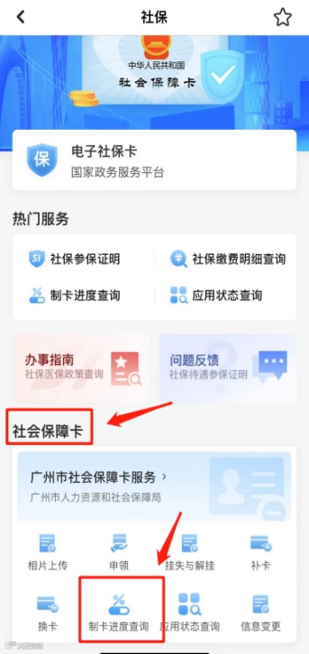 下载“穗好办”APP,在“办事>社保>社会保障卡>制卡进度查询”栏目自助查询。