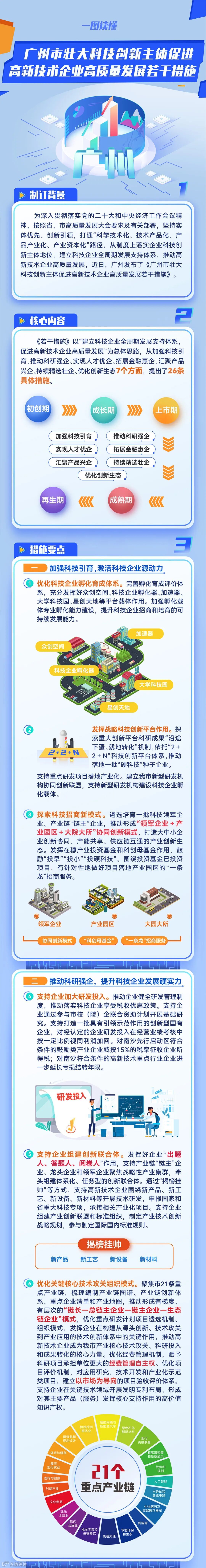 党的二十大报告提出,要“加强企业主导的产学研深度融合,强化企业科技创新主体地位”,习近平总书记强调要“发挥科技型骨干企业引领支撑作用,促进科技型中小微企业健康成长,不断提高科技成果转化和产业化水平”。为落实好创新驱动发展战略,从制度上落实企业科技创新主体地位,建立科技企业全周期发展支持体系,推动高新技术企业高质量发展,由市科技局牵头研究制定了《广州市壮大科技创新主体促进高新技术企业高质量发展若干措施》(以下简称《若干措施》),现经市政府审定后实施。