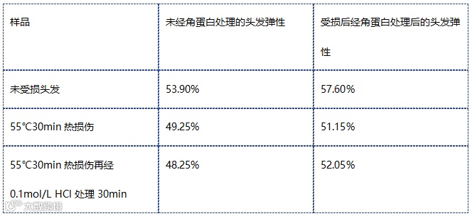 毛发蛋白对热、酸、碱等比较敏感,这些物质会使头发表面受损,干枯分叉,同时弹性和强力也会降低。将受损头发用角蛋白溶液处理,测定处理前后的弹性。