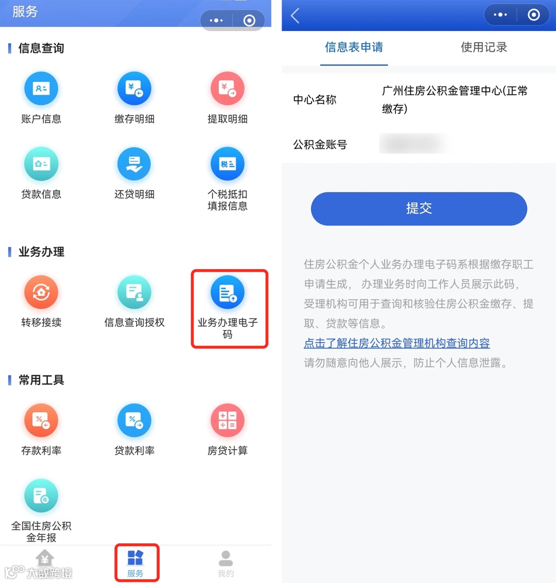 第二步:选择“服务—业务办理电子码—信息表申请”,点击“提交”按钮。“电子码”生成后,缴存人可直接向住房公积金中心出具“电子码”,中心工作人员可通过“电子码”查询到缴存人的缴存、提取、贷款等信息。