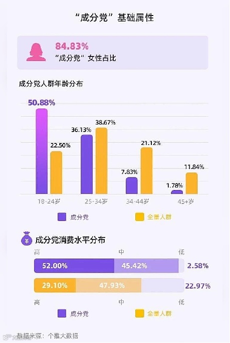 根据个推大数据的资料显示,对成分感兴趣的人群中,女性占比最大,达到84.83%,且全人群中,一半以上年龄在18-24岁,这意味着95后是主力。同时,全人群中高消费水平占52.00%,除了大学生群体,程序员、教师、医生比例也很高。