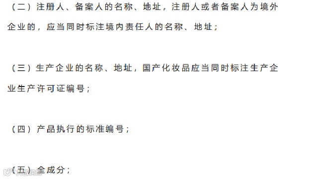 2021年的《化妆品标签管理办法》规定化妆品的中文标签上必须包括注册人、备案人的名称、地址,及化妆品原料的全成分等信息。