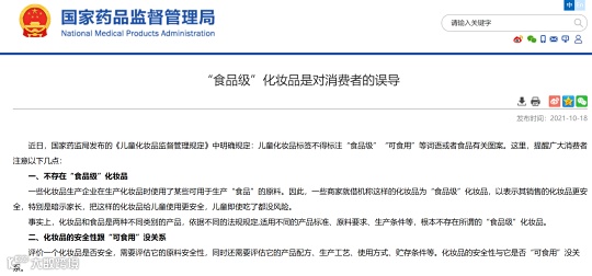 10月18日,国家药监局发布《“食品级”化妆品是对消费者的误导》,称不存在“食品级”化妆品,并强调化妆品的安全性跟“可食用”没关系且误食用化妆品存在安全风险。