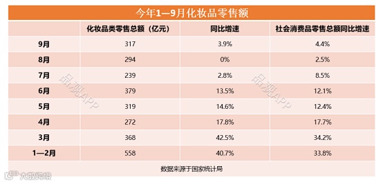 而进入第三季度后,则整体呈现回落迹象。7月份,随着社会消费品零售总额大盘的回落,化妆品类零售额同比增速放缓至2.8%。8月份增速归零,9月略有抬头至3.9%。