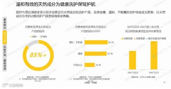 随着Z世代消费者的崛起,高消费的新锐白领和精致妈妈对清洁的需求更为多元化,清洁的同时需要满足肌肤呵护、舒缓敏感等要求,“成分天然、温和、不刺激”成为关键字。