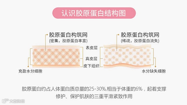 水解胶原蛋白的分子小,非常容易被肌肤吸收,吸收后的水解胶原蛋白被填充到皮肤真皮之间,帮助增加皮肤的紧密度、产生肌肤张力、缩小皮肤的毛孔,使得皮肤变得紧绷有弹性、皱纹减少。