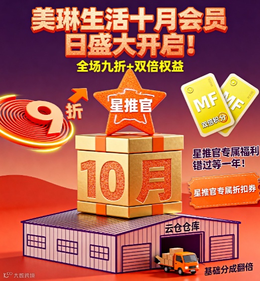 10月4日,美琳生活十月会员日正式拉开帷幕!这场覆盖"消费、创业、生活"全场景的福利盛宴,从商城折扣到星推官特权,从云仓高收益代销到小时达即时服务,每项福利都经过精心设计,让会员花更少的钱享受更多权益。无论是日常囤货还是开启副业,今天行动都能锁定全年最优政策。