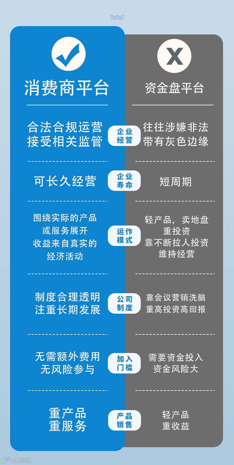 而正规消费商平台则专注于产品销售,关注产品的性价比和消费者的认可度,并通过积分系统让消费者分享经济利益。