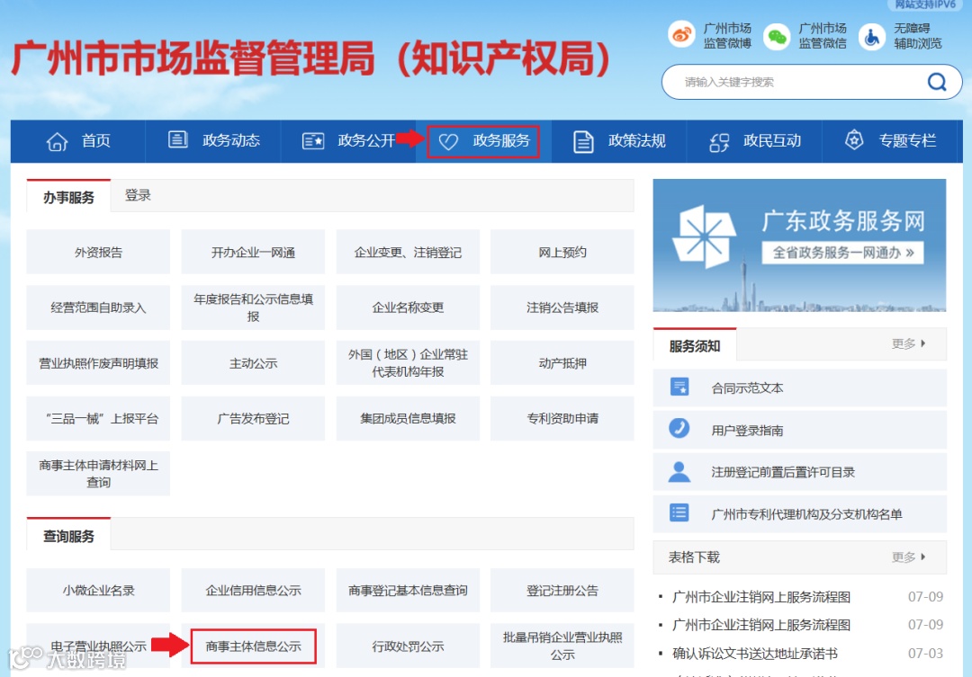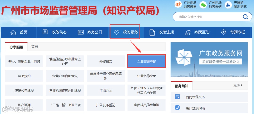 操作路径:广州市市场监督管理局→政务服务→企业变更登记。