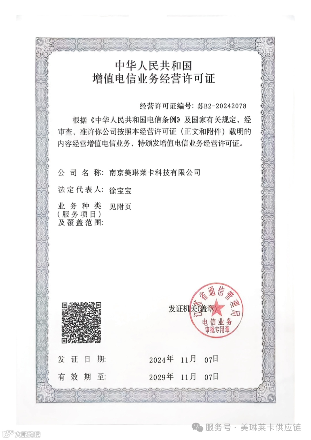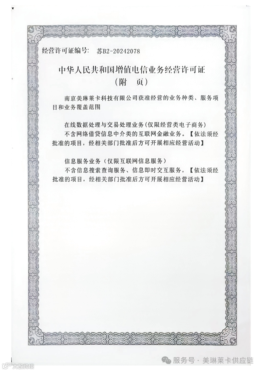 安全保障:美琳莱卡平台具备完整的资质和合法备案,拥有ICP电信增值经营许可证、EDL电商牌照等合法证书,确保平台的合规性。