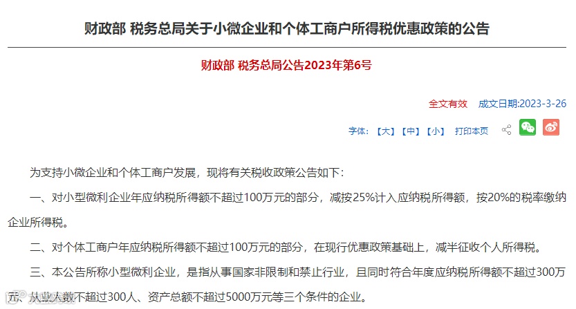 2023年3月27日,财政部 税务总局发布了《关于小微企业和个体工商户所得税优惠政策的公告》。公告中明确了几项重要的税收优惠政策。