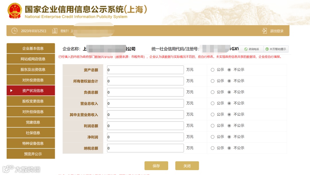 资产状况信息企业可以自主选择是否对外公示。企业应根据报告年度的财务报表或者审计报告的年末数据填写。