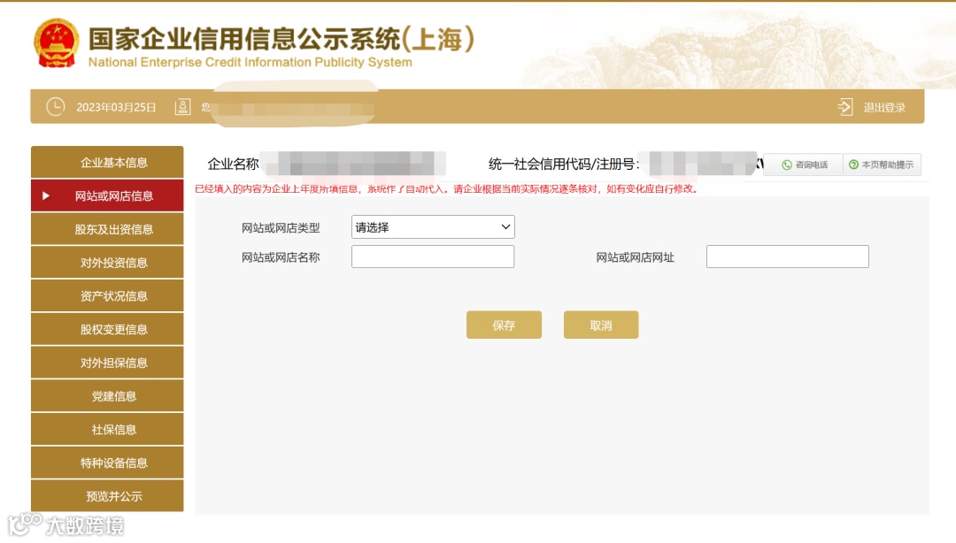 本页中,“报告年度”、“企业名称”、“统一社会信用代码/注册号”在企业登录成功后,由公示系统自动识别匹配。已经填入的内容为企业上年度所填信息,系统作了自动代入。请企业根据当前实际情况逐条核对,如有变化应自行修改。