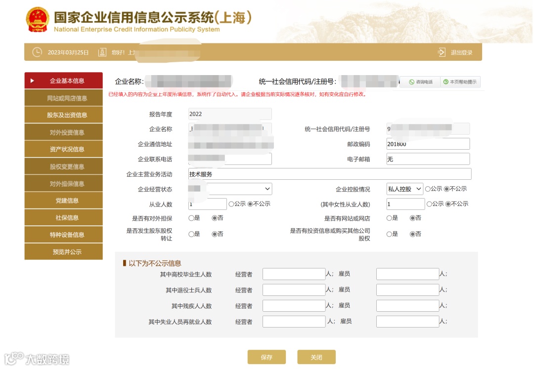 登录方式可选择证照管理员登录、CA登录或电子营业执照登录。登录后再基本页面我们可以看到有10个模块内容需要填写,但这10个并不是比选项,根据企业实际情况填写既可,比如,网站或网店信息,对外担保这些都是有才填,没有是就不需要填写,如图,不需要填写模块你在首页选择否之后,这个模块颜色变深,就无法开了,所以首页基础信息填写很关键。