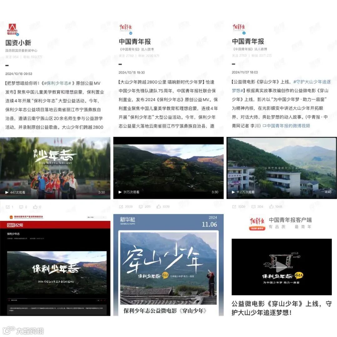 今年,“保利少年志”IP持续发力。打造的原创公益MV以及公益主题微电影《穿山少年》,先后获得国资委、共青团中央,新华社、经济日报、中国青年报,环球网、新浪公益等60余家媒体报道,总阅读量超183万+。“保利少年志”还登上由共青团中央和中青报全媒体直播的特别节目“青春中国·拥 Bao 未来”,直播全网话题度及传播量过亿。