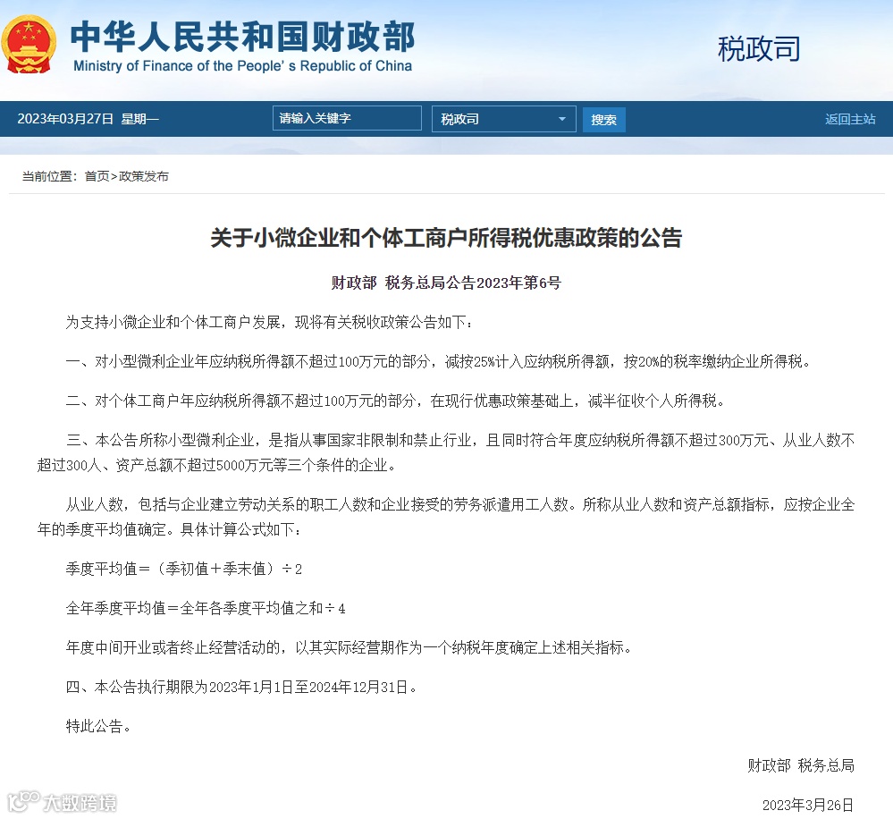 3月27日,财政部 税务总局发布《关于小微企业和个体工商户所得税优惠政策的公告》(公告2023年第6号):