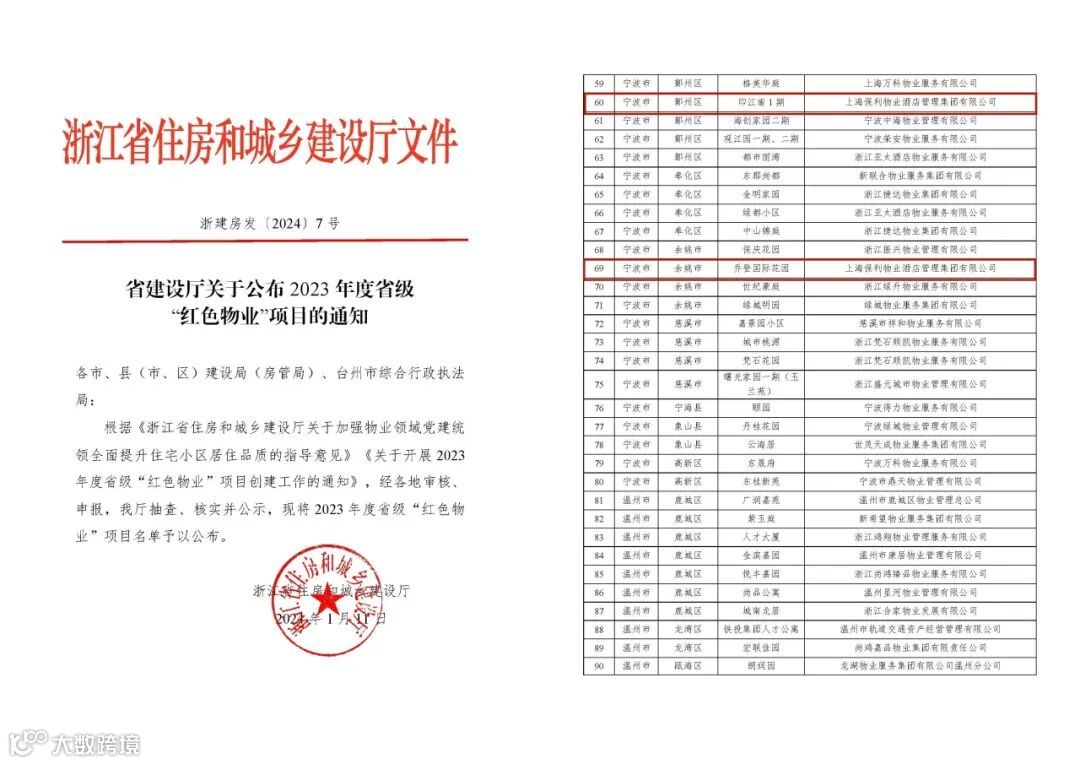 1月,浙江省住房和城乡建设厅发文公布了2023年度浙江省省级“红色物业”项目评选结果,保利物业浙江公司印江南1期和乔登国际花园荣获2023年度浙江省“红色物业”项目荣誉称号。这是保利物业践行“保利是吾乡”全新品牌发展观,推进服务品质提升和高质量发展的体现。