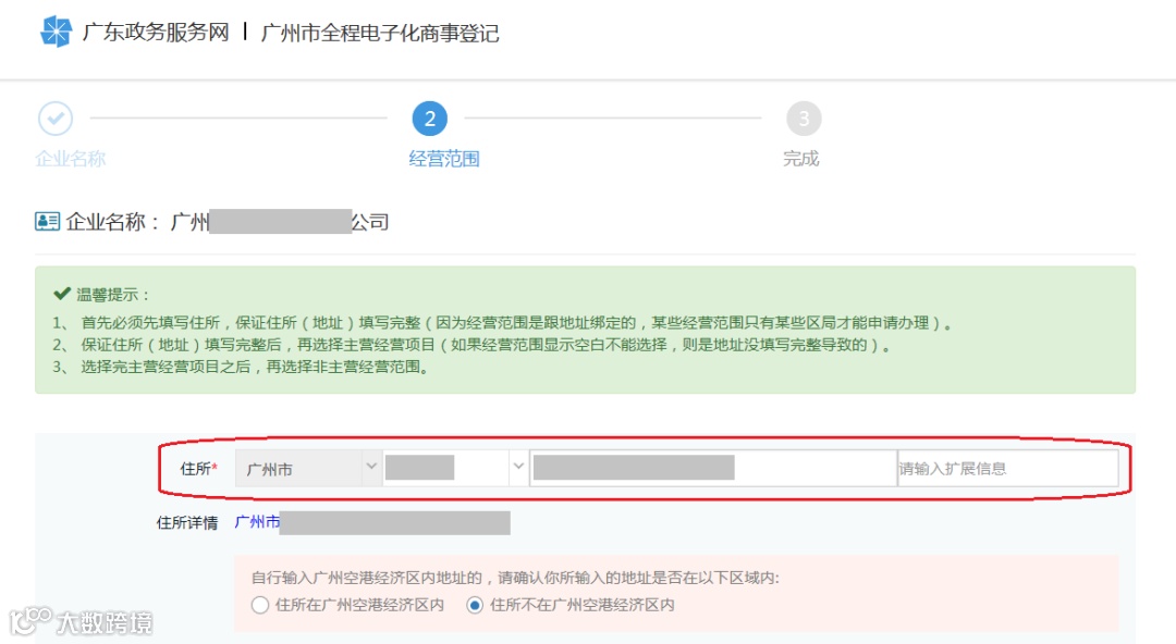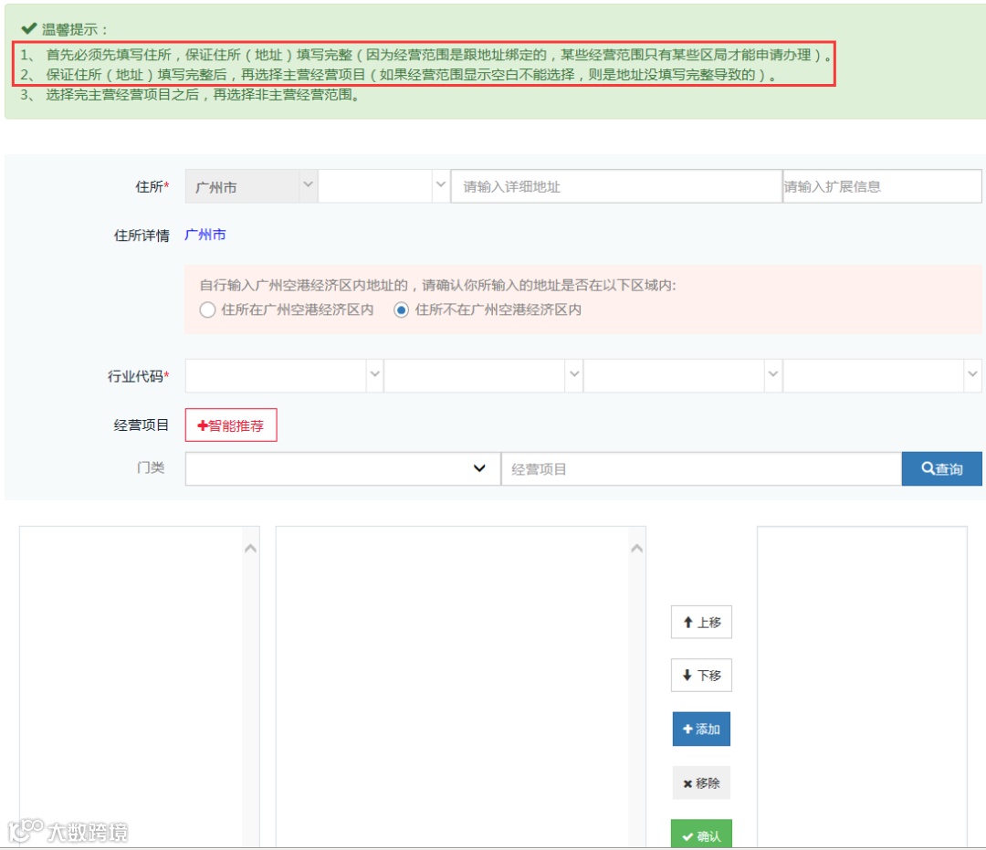 您看到经营范围录入的操作页面最上方有地址信息填写栏目吗?地址信息必须填写且保证地址信息完整,如不填写,网页可能出现不能正常显示经营范围信息,因为经营范围是跟地址绑定的,某些经营范围只有某些区局才能申请办理。