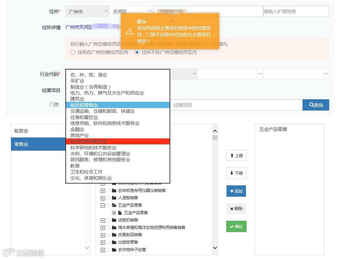 的确没选对!我的主营项目是批发业,但我第一个经营项目选了商务服务业。现在更正后就可以了,谢谢。