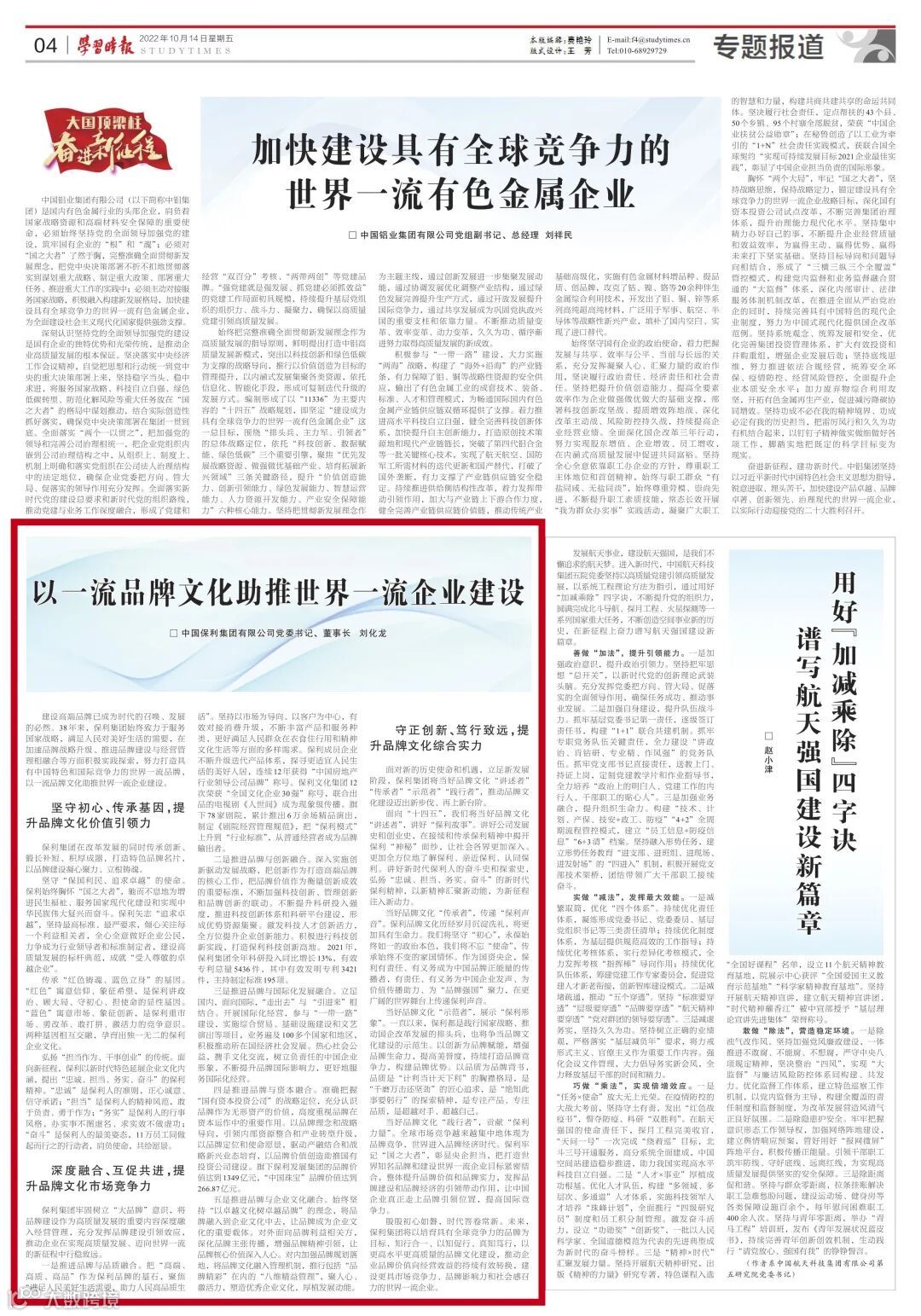 10月14日,《学习时报》刊发保利集团党委书记、董事长刘化龙《以一流品牌文化助推世界一流企业建设》署名文章。文章介绍了保利集团38年来始终服务国家重大战略与人民美好生活需要,以高质量品牌文化建设引领企业行稳致远的壮阔实践。数十载奋楫扬帆勇立潮头,未来,保利集团将持续做好品牌文化、厚植发展动能,以丰硕成果献礼二十大,在建设世界一流企业的道路上勇毅前行。