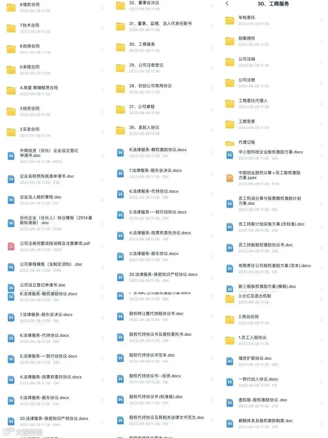 1、72套股权分配方案、62套股权代持方案、55套股权激励方案、39套员工入户方案、40套学习股权转让方案…
