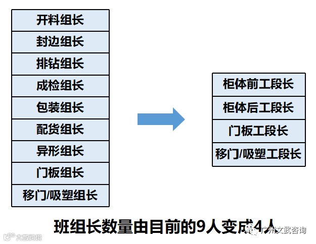 文武老师进驻项目后了解到,F公司生产车间现有的班组长数量为9人,基本上每个工序都设有组长一职,但由于管理人员数量较多,也暴露出工作对接繁琐、处理问题效率低、责任不明确等现象。另外,现有班组长均不脱产,在日常作业与管理工作中无法取得平衡,这也导致他们对岗位的认可度低,班组建设积极性不高。