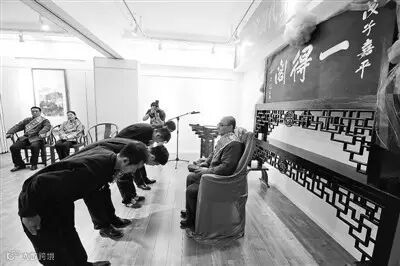 收徒仪式现场,在递交拜师帖、鞠躬敬茶后,师徒一起向“一得阁”老匾宣誓,“一得阁”第二代传人、公私合营后首任厂长张英勤见证了这一刻,这位第二代传人已经是90多岁高龄。58岁的制墨师尹志强是昨天收徒的3位师傅之一,据他介绍,他几年前已经退休,“一得阁”又把他请回来,专门带徒弟。