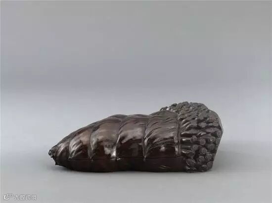 更值得惊叹的是:瘿木砚盒。砚盒极似乌龟,龟首、龟足内缩,龟背已琢出龟甲,某些龟甲已刻纹样,但因陈端友去世,余下的工艺就延宕下来。在砚盒内部,陈端友甚至还刻出了乌龟骨骼的形状,可见这位制砚大师对完全“写实”技艺的追求。