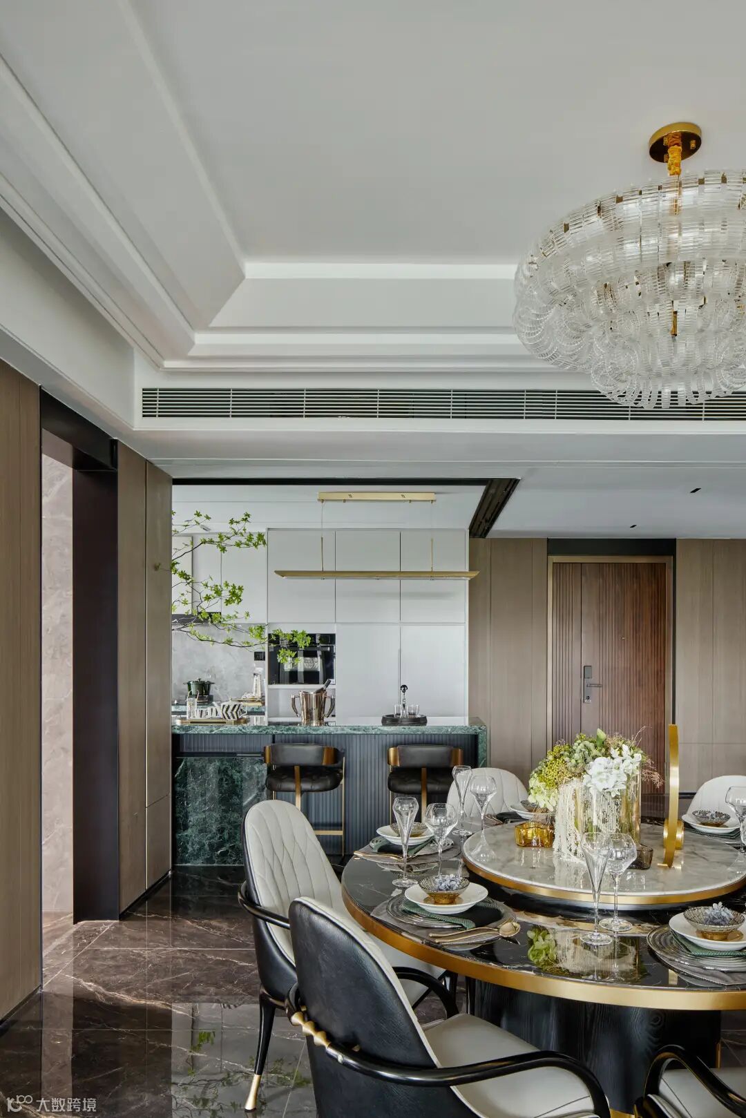 保利和光尘樾约230㎡户型,半开放式厨房运用吧台设计过渡到餐厅,既能增强两个空间的交流互动,带来味蕾和精神的双重慰藉,还能大大提升空间的通透感。