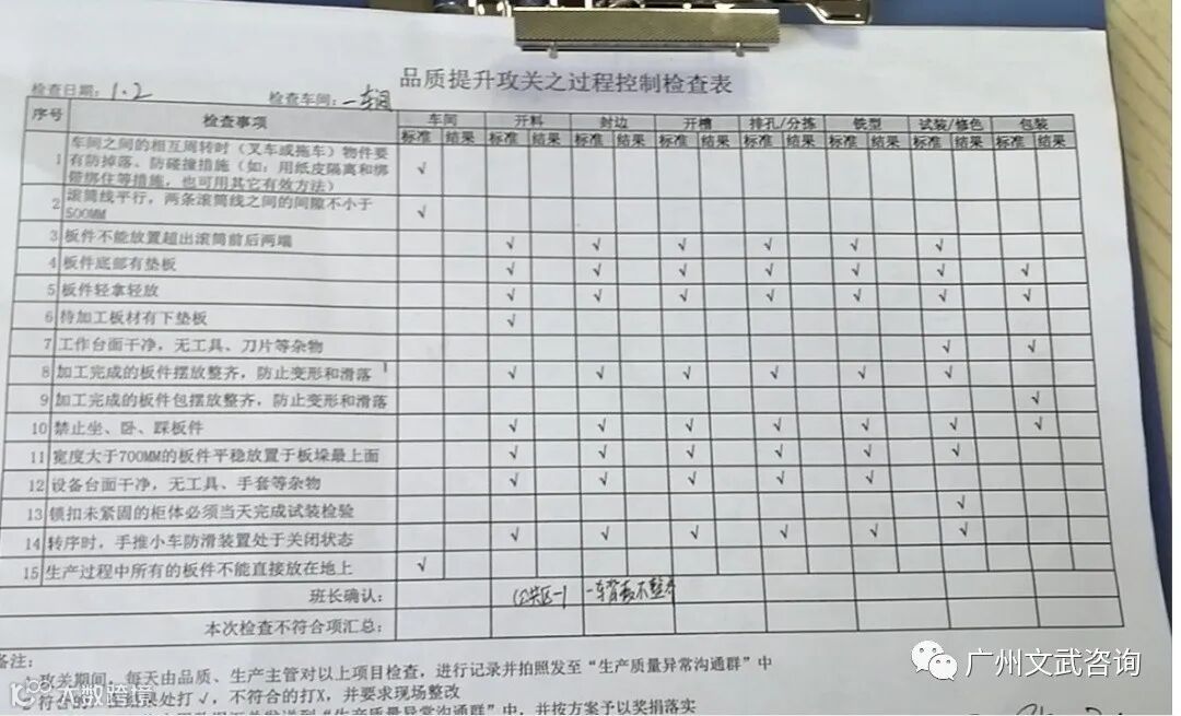 1. 组织攻关活动,制定攻关目标,让所有员工参与期中,由质检员、车间管理人员、总经办督导和文武老师一起对行动纲领的执行情况进行检查。