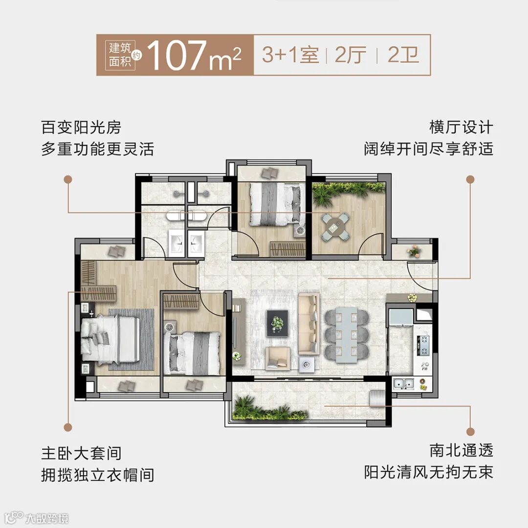 户型方面,107㎡3+1房,不仅满足功能性居住,而且转向品质和生活运营。