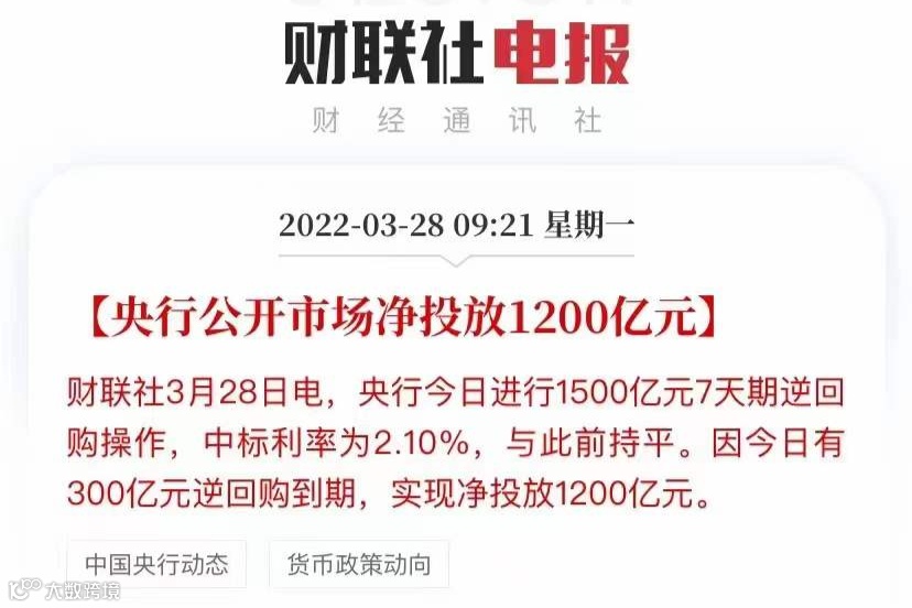 再加上3月28日,央行公开市场开展了1500亿元逆回购操作,期限7天,利率2.1%,与此前保持一致,实现净投放1200亿元。