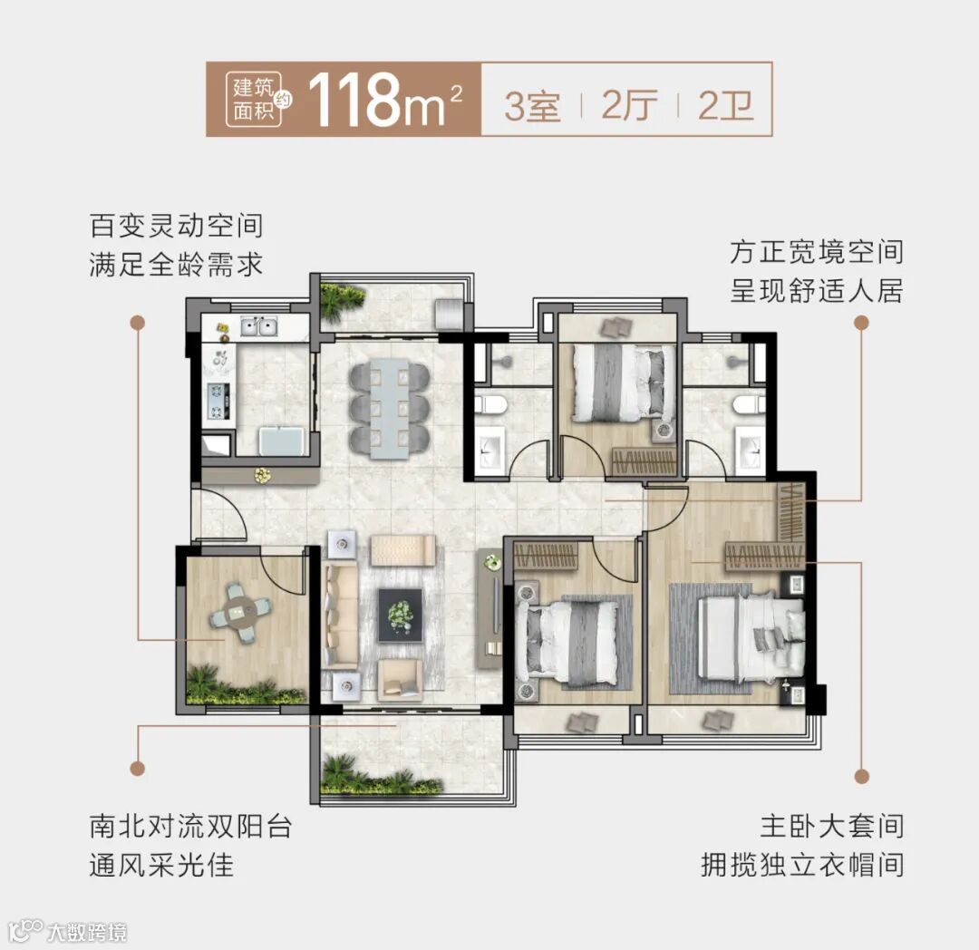 还有建面约118㎡3+1房,南北双阳台对流,通风、采光俱佳,不仅让日常洗晾衣物有了去处,还能有观赏美景的空间。