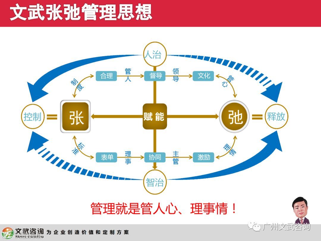 传统的管理是讲控制,新时代的管理除了做好管理控制,也要释放人性的优点。文武咨询认为,新时代的管理要降低对人的依赖、发挥人的创造力,老子在道德经中描述最好的管理是“太上、不知有之”,如果组织中员工不认识领导、不清楚公司具体的制度,但他自己却自动自发的正确的执行,你要问他为什么做得这么好,他说我本来就应该这样做,这就是文武张弛管理思想的最高水平。