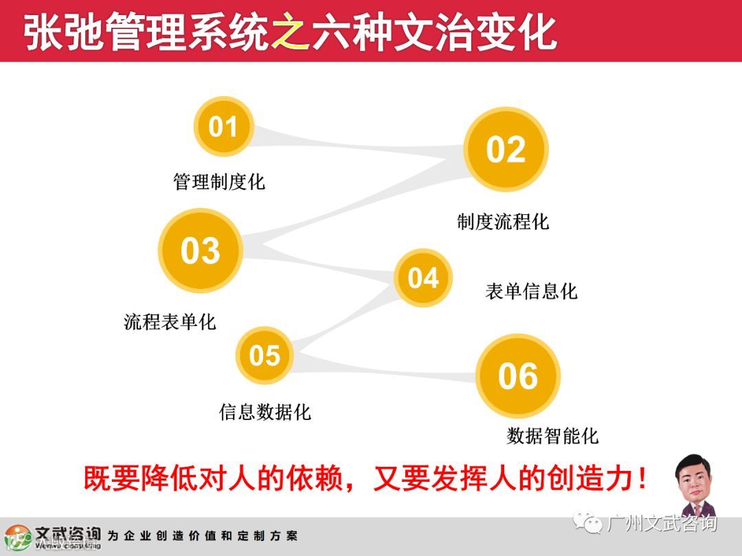 文武咨询认为制度大过领导、标准大过主管,文武之道、一张一弛,管理要张弛有度,企业做大做强的过程是人治到智治的进化过程。新时代的管理者要利用组织资源赋能被管理者,企业有合理的制度需要督导提升执行水平;新时代的管理者要改变传统的命令式管理,让企业的人、机、料都协同起来,这里的核心就是信息化、数据化,通过协同缩短流程、提升效率,走向智治。
