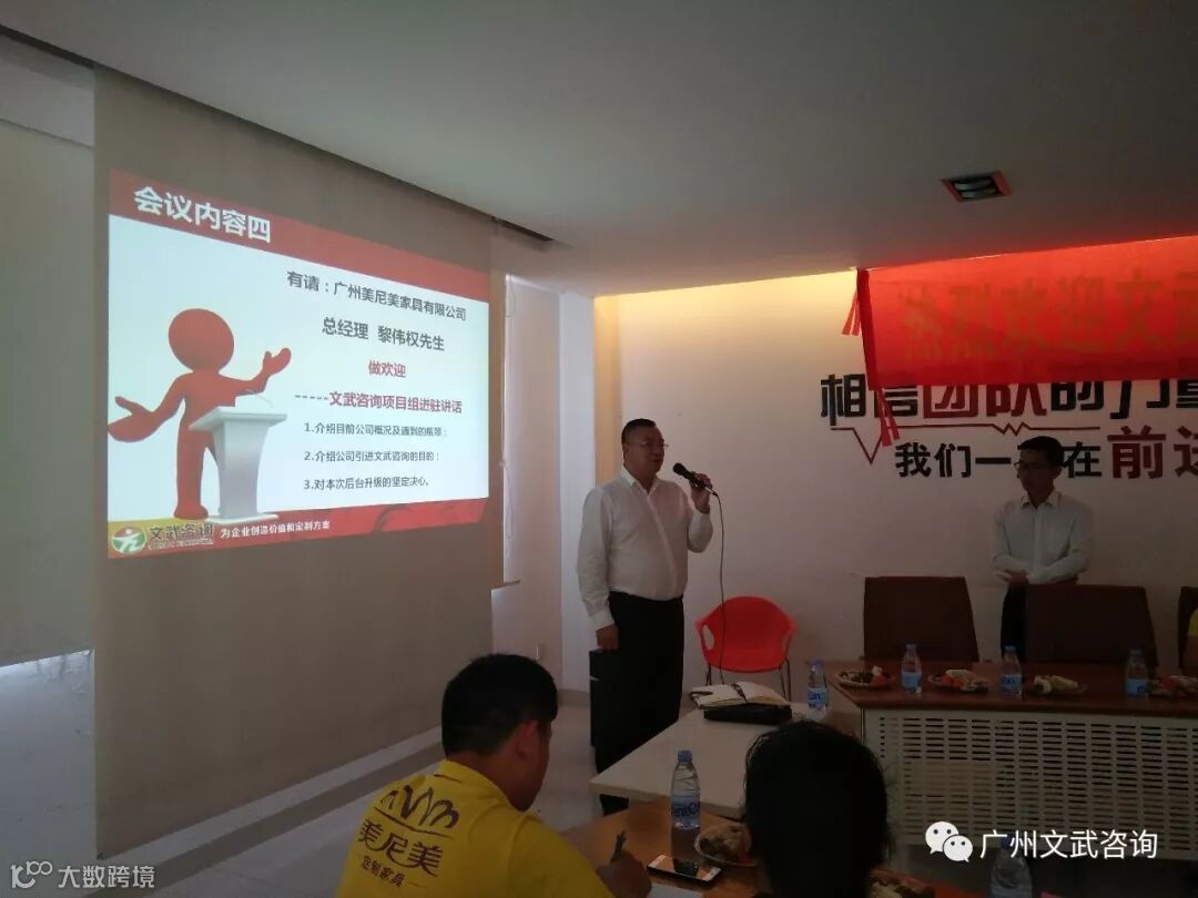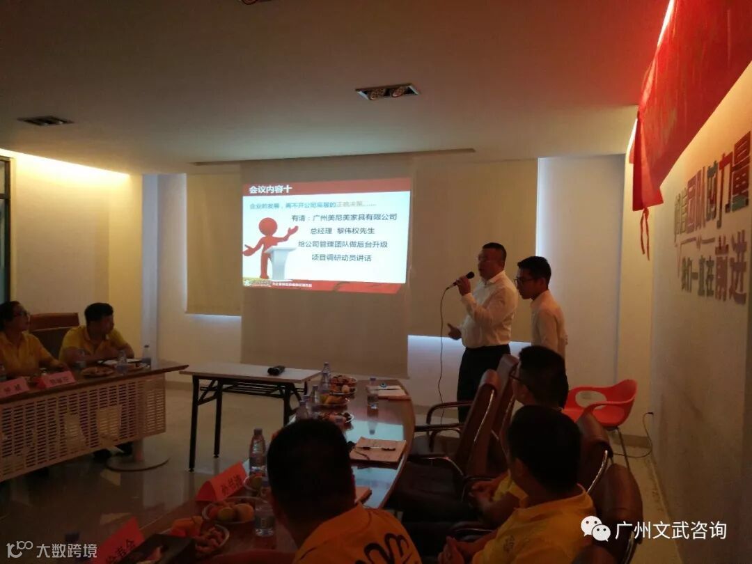 随后,文武咨询驻美尼美项目组组长蔡国柳老师就本次调研事宜及项目展开步骤进行了讲解。广州美尼美家具有限公司总经理黎伟权先生做了调研动员讲话,再次表达了将后台升级进行到底的决心。现场的氛围是一浪高过一浪,激起了管理人员高昂的斗志。