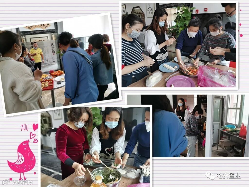 阳春三月,乍暖还寒。为了庆祝2020年“三八”国际劳动妇女节,3月8日,裕安地产组织了以“三八丽人节 — 如花绽放;手工包饺子 — 暖心过节”为主题的包饺子活动,邀请女同胞们吃爱心美食饺子!!