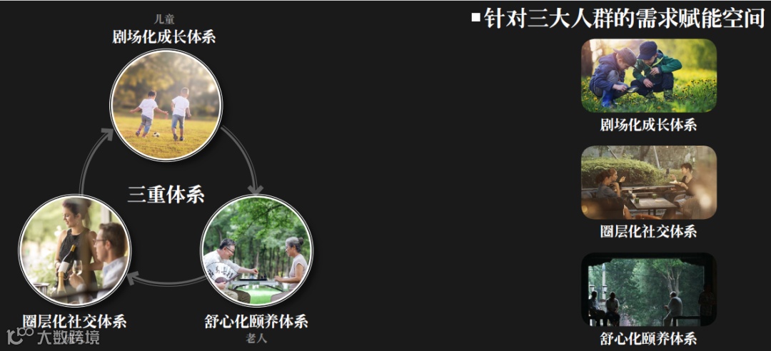 例如针对儿童,注重剧情化成长体系的打造,IP主题乐园、小型足球场、特色树屋、艺术花海等,此外还特别搭配了开放式讲堂和四点半学堂,供孩子学习交流。