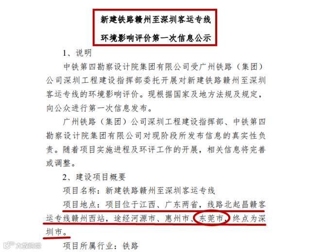 从中铁第四勘察设计院集团有限公司官网获悉,赣深高铁发布环境影响评价第一次信息公示,公示显示,赣深高铁路线途径东莞市,即为赣深高铁的西线。而西线在东莞境内是从塘厦穿过,最终到达深圳北站。