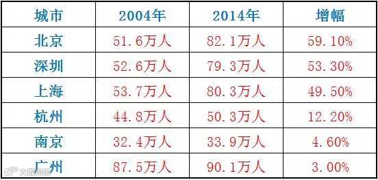 在北上广深天这五个一线城市,房价都是高的令人胆寒。而一线城市与强二线城市人口增量都很大。下面以2004年到2014年小学在校生人数增长作为一个指标来看看几个一线城市和强二线城市的人口增长情况: