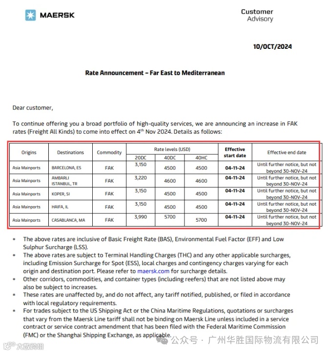 10月10日,马士基发布公告,为了继续为您提供广泛的高质量服务组合,宣布从2024年11月4日起提高远东至地中海的FAK费率。详情如下: