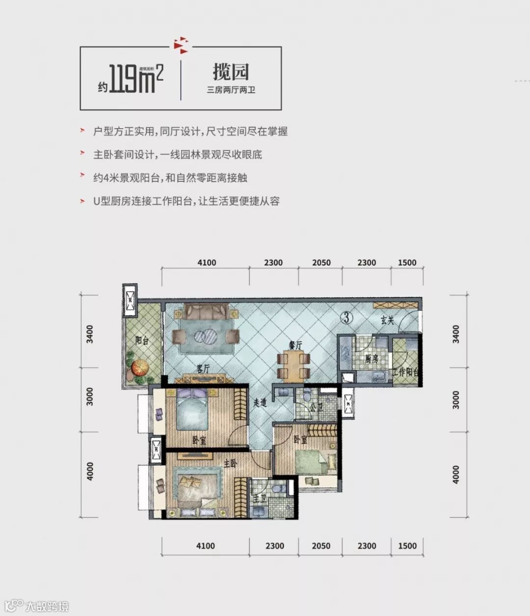 119㎡园景三房,70米超宽楼距,无遮挡看整片中轴园景,举目即是层次错落的风景,生活因此惬意无比。
