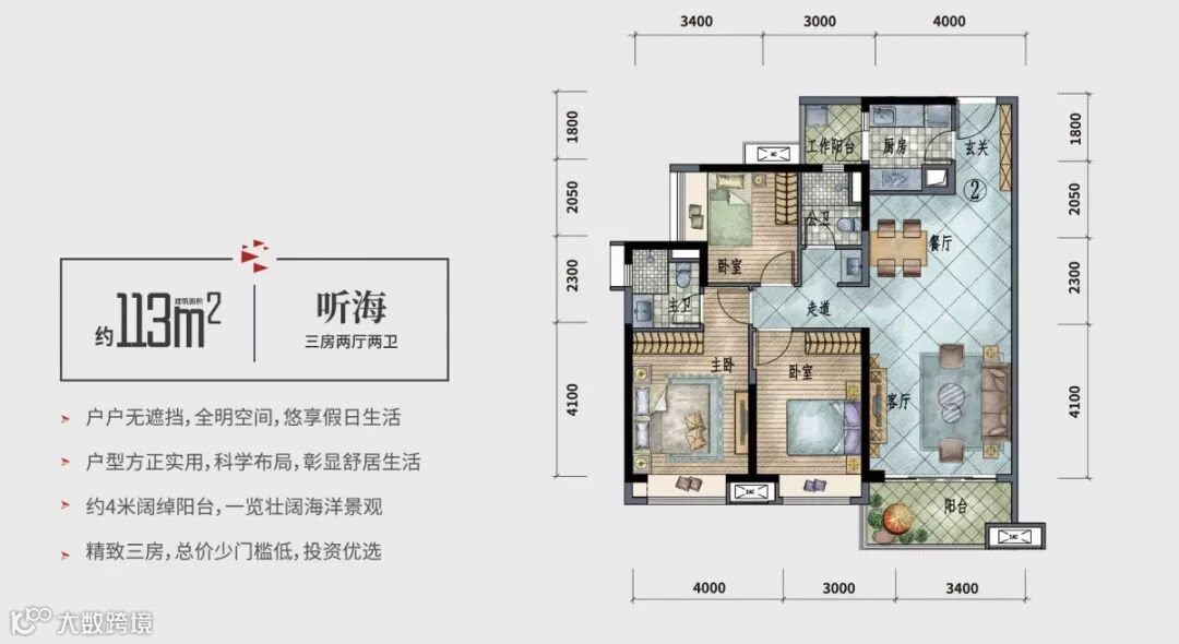 113㎡海景三房,建筑面积看起来不大,却轻松做到三开间朝南,客厅、主卧、次卧皆朝南,约4米阔绰阳台,南望宽敞伶仃洋景观,海景生活无需别处寻觅。