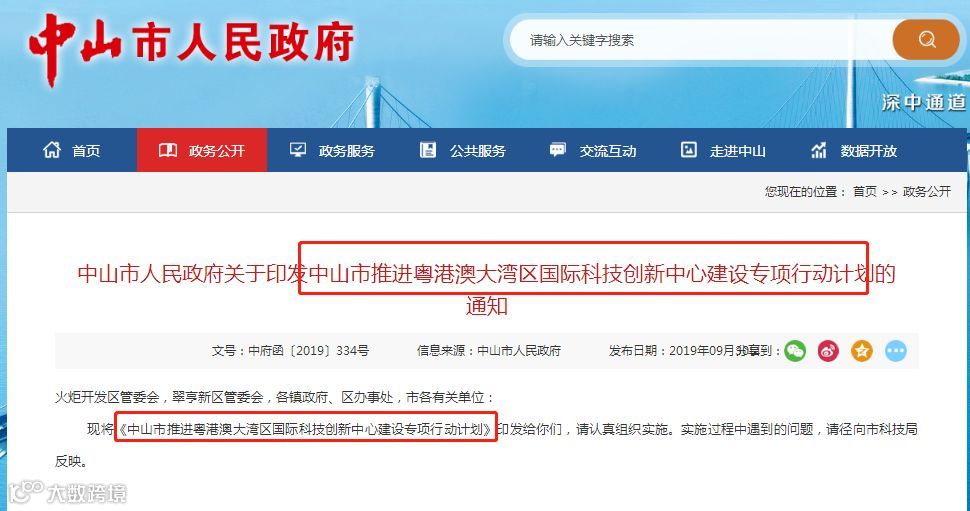 10月16日,中山市政府网站官方公众号发布了《中山市推进粤港澳大湾区国际科技创新中心建设专项行动计划》。