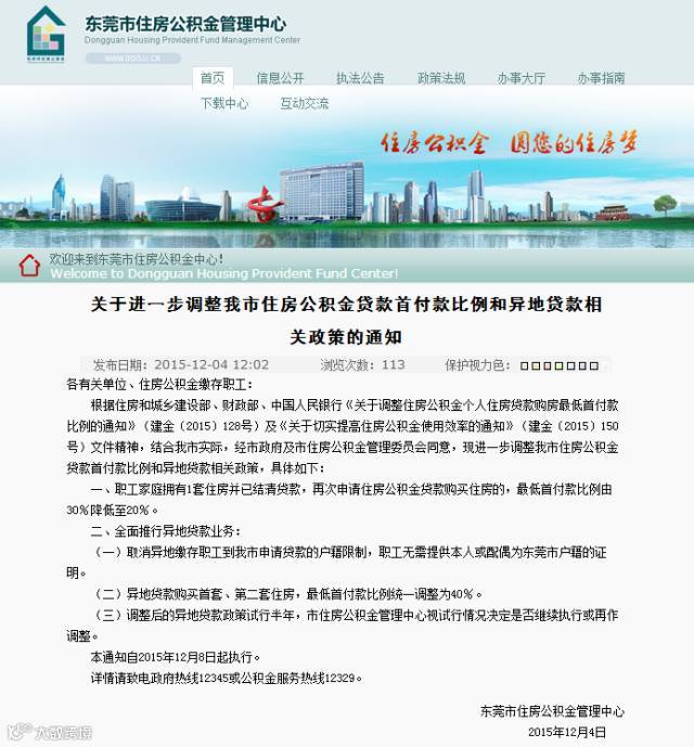 话说上周五,东莞市住房公积金管理中心发布《关于进一步调整我市住房公积金贷款首付款比例和异地贷款相关政策的通知》(以下简称《通知》),宣布从12月8日起,在东莞职工家庭拥有1套住房并已结清贷款,再次申请住房公积金贷款购买住房的,最低首付款比例由30%降低至20%。同时取消异地缴存职工在东莞申请贷款的户籍限制,异地贷款购买首套、第二套住房,最低首付款比例统一调整为40%。