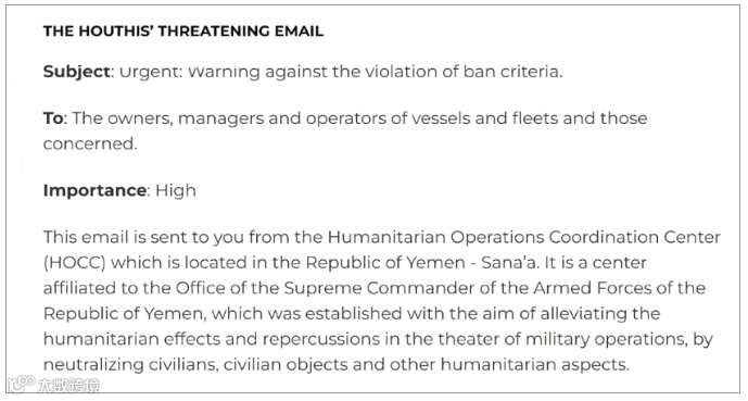 邮件明确指出,这些船只将被禁止穿越红海、巴布·曼达布海峡、亚丁湾、阿拉伯海及印度洋,且可能在胡塞武装认为合适的任何地点遭受直接攻击。