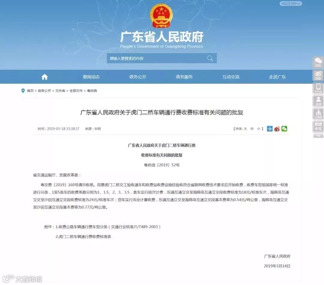 日前,一份名为《广东省人民政府关于虎门二桥车辆通行费收费标准有关问题的批复粤府函〔2019〕52号》(以下简称《收费标准》)的文件在省政府官网上公布,虎门二桥的收费标准也随之浮出水面。
