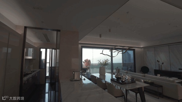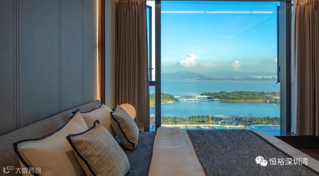 客厅开间约7.9米,从推门那一刻,海对岸的香港、深圳湾海景、城市天际线、公园景观,一览无余,IMAX剧院式视野,展现出一幕层次丰富、无与伦比的景观盛宴。