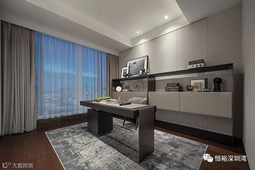 格调书房,大尺度海幕落地窗纳浩瀚湾区盛景入眼,书海无涯当乐作舟。