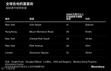 他们就像是另一座“瑞士银行”。无论美国经济如何发展,Billionares’Row的豪宅价值永远在UP。根据莱坊国际(Knight Frank)2019年公布的研究,过去五年,曼哈顿57街上售出的价值在2,500万美元(折合人民币1.75亿)以上的豪宅数量位居世界之首。